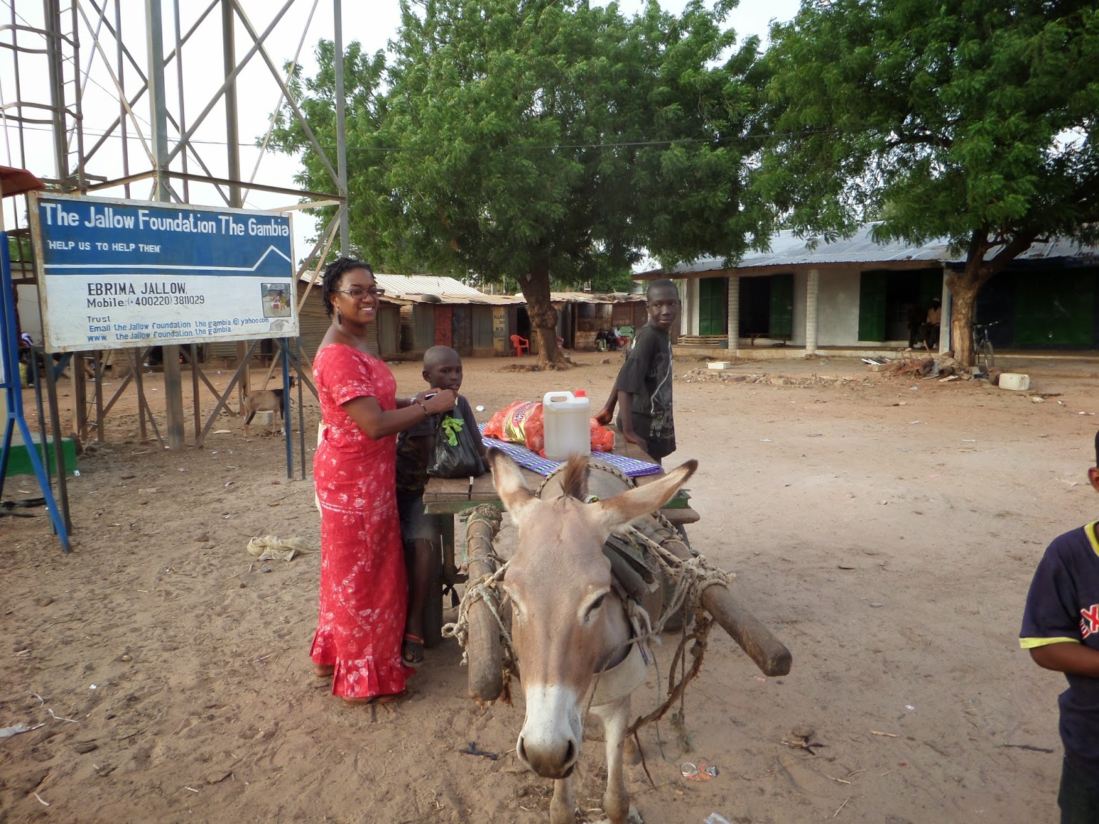 Donkey carts are ubiquitous in The Gambia. You see them up country and you see them in the city. I was recently in Soma and was with another volunteer who lives there. She was buying food for her host family to use during Ramadan as silifando (a gift). The families all fast during the daylight hours but have better food than usual during the Ramadan after they break fast so Natasha had purchased a big bag of onions, 3 liters of vegetable oil, some spices and vegetables for her family. Instead of throwing the purchases in the trunk of a car ala America, it was time to use the donkey cart. This donkey cart was driven by a boy who looked to be about 9 or 10 years old along with his younger brother. In the picture below you can see Natasha and the younger brother plus the purchases loaded on the cart.